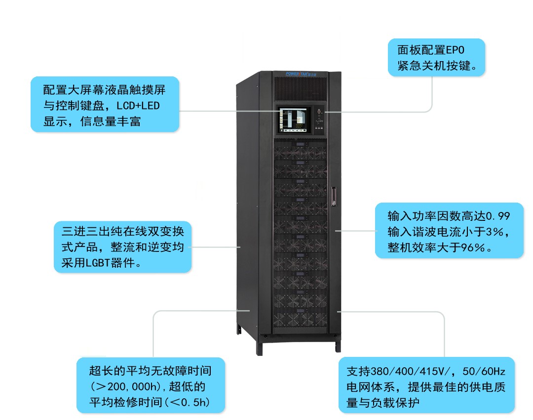 寶士達醫用高端UPS不間斷電源系統,是為滿足電力系統的更高要求而設計的高可靠性產品。該系統采用獨創的在線式雙變換結構,三進三出的運行方式;所有功率半導體器件均采用進口集成模塊,大大提高了系統的可靠性。該電源系統由多臺獨立的功率模塊并聯,在無主同步的條件下運行,實現了N+X并聯冗余備份工作,大大提高了系統的整機可靠性;該電源系統具有完善的自我檢測和保護功能、采用大屏幕帶觸摸屏LCD、圖形化操作界面、智能化的“人-機”對話菜單及遠程監測監管功能。該電源系統整流器和逆變器均采用了業內先進的三電平技術,使系統的效率達到96%,是目前業內體積小、效率高、能耗比低、功率密度大的產品,并具有較高的性價比。