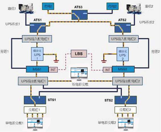 為了消除可能出現(xiàn)在UPS并機系統(tǒng)輸出端與用戶端之間的“單點瓶頸”故障隱患,有必要配置雙總線模塊化(N+X)UPS的輸出配電系統(tǒng)。其基本配置是由“N+1”型模塊化UPS冗余供電系統(tǒng)(優(yōu)選“1+1”或“2+1”型并機供電方案)+輸出配電柜+負載自動切換開關(LTS)所組成的UPS輸出供電系統(tǒng)。對于某些要求較高的場所,還應配置由負載同步控制器(LBS)+兩套“N+1”型模塊化(N+X)UPS冗余供電系統(tǒng)所組成的具有較高“容錯”功能的供電系統(tǒng)。鑒于目前在IDC機房中所用的服務器和磁盤陣列機等產(chǎn)品中有(30~50)%為采用“雙電源輸入供電”體制的產(chǎn)品,對于這些設備,可以直接將分別來自兩套“N+1”型并機系統(tǒng)的電源連接到這種“雙電源輸入設備”的兩個輸入端上。對于采用“單電源輸入供電”方式的關鍵負載,則是將分別來自兩套“N+1”型并機系統(tǒng)的電源首先連接到“負載自動切換開關”(常見的是STS型的靜態(tài)開關和SS型的快速切換開關)的兩個輸入端上,然后再將用戶的關鍵設備連接到“負載自動切換開關”的輸出端上。