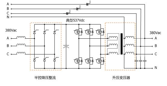 工頻機(jī)結(jié)構(gòu)UPS技術(shù)出現(xiàn)在上世紀(jì)70年代,因其整流工作頻率與電網(wǎng)頻率一致而得名。受制于當(dāng)時(shí)半導(dǎo)體技術(shù)發(fā)展,逆變器中IGBT器件耐壓只能做到600V,故母線電壓受限,逆變器輸出電壓不能做到380V;而且工頻機(jī)逆變器是全橋電路,輸出為三相火線,無法滿足單相IT負(fù)載和三相四線制負(fù)載的需求,必須進(jìn)行Δ-Y轉(zhuǎn)換。為解決這些問題,廠家在工頻機(jī)逆變器輸出端加入了變壓器用于升壓和產(chǎn)生中線,以使輸出電壓滿足負(fù)載的要求,這便是工頻機(jī)內(nèi)置變壓器的真實(shí)目的。圖-1所示為工頻機(jī)的典型拓?fù)洹?/span>