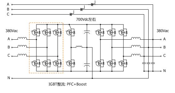 ????而到上世紀(jì)90年代,第三代溝槽型IGBT面世,其耐壓能力提升至1200V,促使了UPS技術(shù)的革新。通過整流側(cè)高頻升壓電路將母線電壓提升至700V左右,逆變器輸出電壓可以做到380V,輸出變壓器得以取消。而這種整流逆變電路都工作在高頻(幾kHz以上)且沒有輸出變壓器的UPS就被稱為高頻UPS。圖-2所示為一典型的高頻機(jī)拓?fù)洹?/span>