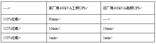 第一,過載能力強(qiáng),抗負(fù)載沖擊能力強(qiáng)。過載能力是IEC62040-3中要求標(biāo)稱的關(guān)鍵指標(biāo)之一,其強(qiáng)弱可通過實(shí)際數(shù)據(jù)來衡量。表-1所示為同一廠商的工頻機(jī)與高頻機(jī)過載能力,由表-1可知,兩類機(jī)型過載能力并沒有區(qū)別。