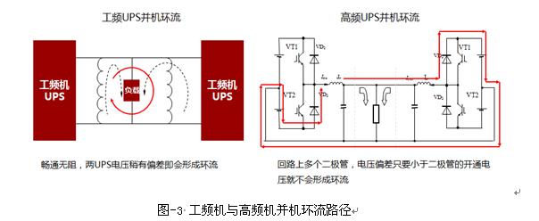 實(shí)際上,變壓器的設(shè)計(jì)反而增大了環(huán)流的風(fēng)險(xiǎn)。圖-3所示為兩類機(jī)型的環(huán)流路徑。工頻機(jī)UPS的并聯(lián)就是變壓器的直接并聯(lián),整條回路上沒有器件限制,電壓的偏差很容易產(chǎn)生環(huán)流。而高頻機(jī)的環(huán)流路徑上具備多個(gè)二極管,小于2V的電壓差根本形不成環(huán)流。