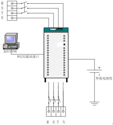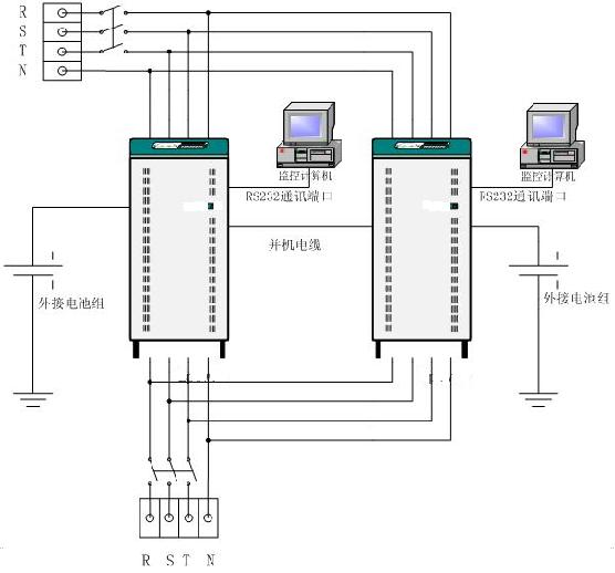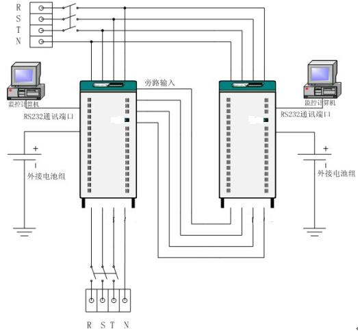 說明:用2臺單機系列的UPS串聯運行。即一臺作為主機,另一臺的輸出接到主機的旁路輸入端,作為備用機。